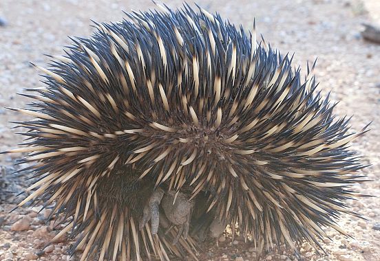 L’ECHIDNA a prima vista appare come un grazioso agglomerato di aculei e di peli da cui sporgono un sottile muso allungato e quattro zampe tozze, quelle posteriori con i piedi rivolti all'indietro.