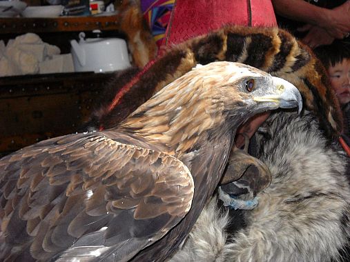 Un'ora dopo arrivammo su un altopiano dove si trovavano tre gher. L'uomo ci invitò a scendere, ci presentò la moglie e i figli e ci fece entrare nella tenda centrale. Cominciò il solito rituale del té, fra molti convenevoli. Poi il padrone di casa uscì e, dopo qualche minuto, rientrò sorridendo. Appollaiata sull'avanbraccio aveva una sorpresa: Kran. L'aquila cacciatrice.