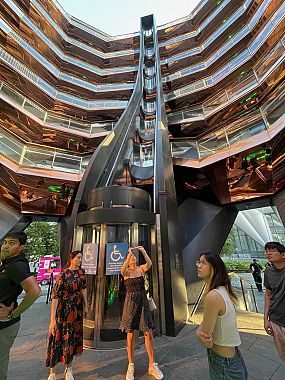 Largo 15 metri alla base per 46 metri di altezza, il Vessel ricorda vagamente un alveare. E’ formato da 154 rampe che intersecano 80 terrazze, affastellate su 16 piani. In tutto, 2.500 scalini. I pezzi sono stati fabbricati e assemblati in Italia, a Monfalcone, e trasportati a New York via nave. Un’opera faraonica, voluta dai committenti degli Hudson Yards per completare la piazza pubblica centrale con una scultura interattiva dalla forma sensazionale. Il progettista, Thomas Heatherwick, concretizzó le loro aspettative ideando un agglomerato di ferro, bronzo e cemento su cui i cittadini si potessero arrampicare, per sperimentare l'emozione dell'ascesa e osservare la città e il fiume da una prospettiva insolita.