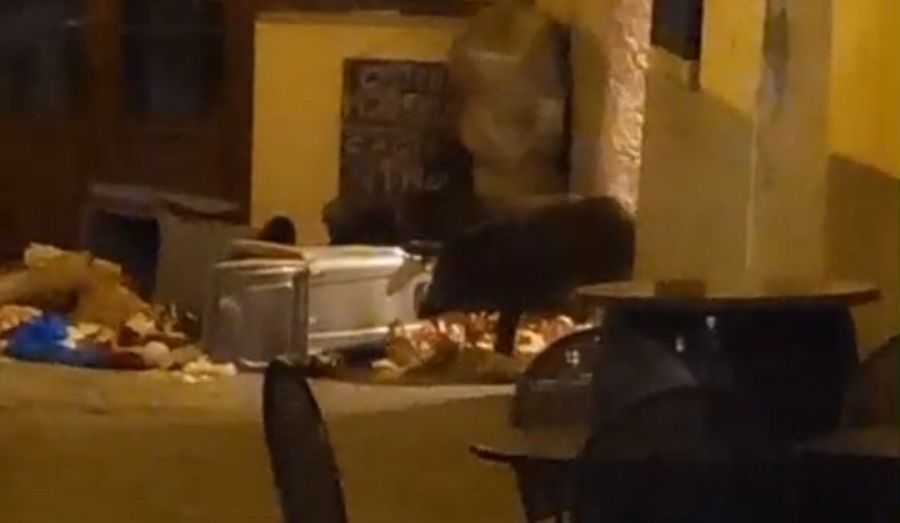 CAMPO NELL'ELBA — Anche stanotte, come ormai accade sempre più spesso, un gruppo di cinghiali affamati ha preso d'assalto i bidoni di un locale nel centro abitato di San Piero.