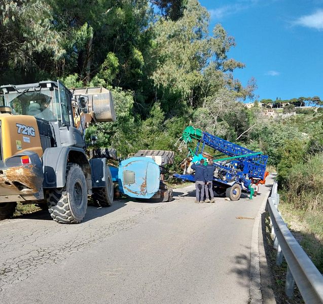 Si trattava di un trattore con annessa una gru che, per motivi ancora da appurare, si è rovesciato ostruendo completamente la carreggiata.