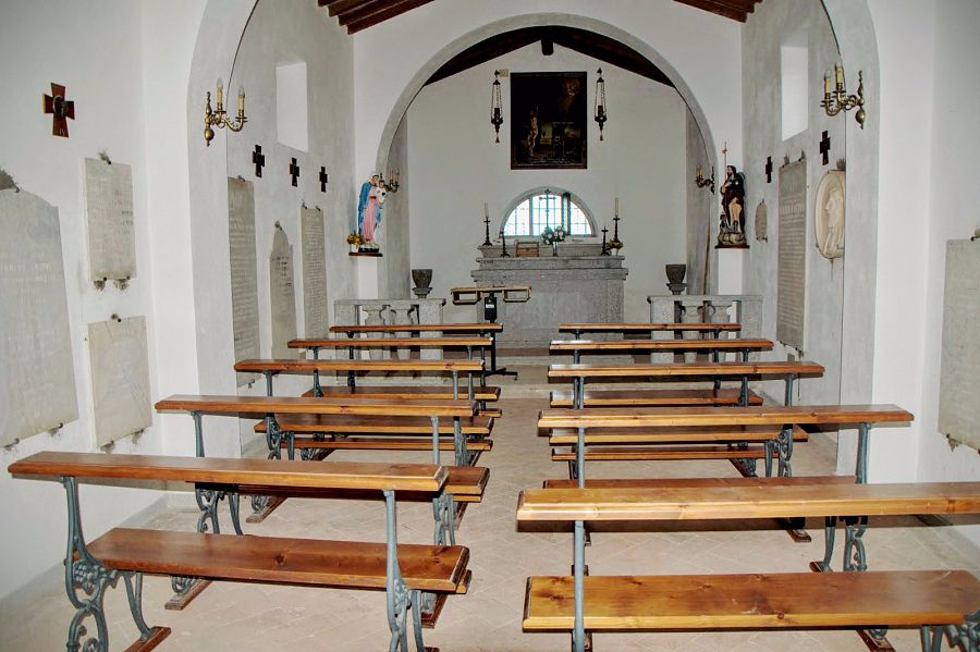 Sullo spiovente di sinistra è un campanile a vela provvisto di campanella. All’interno erano state installate lapidi marmoree commemorative provenienti dal muro di cinta del cimitero in occasione di lavori di ampliamento del l’anno1900.