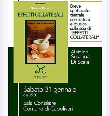 CAPOLIVERI — Sabato 31 Gennaio, presso la sala consiliare di Capoliveri, al terzo piano del Palazzo comunale, alle ore 15,30 si terrà la presentazione con reading teatrale musicale, con al violino Susanna Di Scala, del nuovo lavoro editoriale di Marinella Da Roit, “Effetti Collaterali”, Persephone Edizioni.