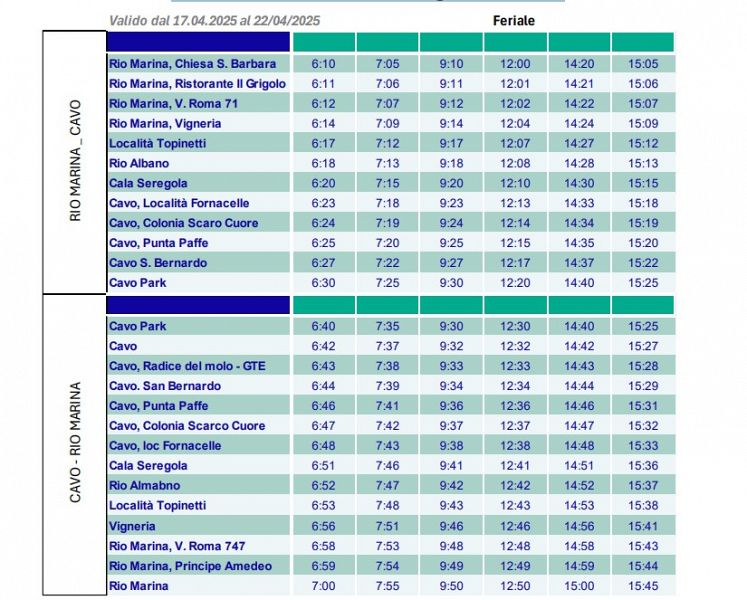 Nei giorni feriali del periodo dal 17 Aprile 2025 al 22 Aprile 2025 (Vacanza Scuola Pasqua) Il collegamento tra Cavo e Rio Marina viene effettuato con servizio di navetta ai seguenti orari: