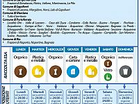 Per esempio, il lunedi sera entro mezzanotte deve essere esposto il sacchetto di plastica e metallo che verrà ritirato il martedì; martedì sera invece entro mezzanotte deve essere esposto il sacchetto di organico che verrà ritirato il mercoledì, ecc).