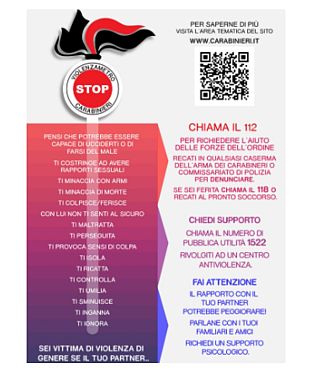 Un breve vademecum, redatto dall’Arma, può fornire dei suggerimenti utili: non confidare sui cambiamenti di carattere e di comportamento promessi da un partner violento e non lasciarsi influenzare negativamente dalle sue offese e dalle sue minacce; in caso di ferite o lividi andare quanto prima al Pronto Soccorso di un ospedale e dichiarare la verità; chiamare appena possibile il “112 NUE” Numero Unico Europeo per le Emergenze; rivolgersi ad appositi centri che possono dare consulenze legali, bancarie e psicologiche gratuite o contattare telefonicamente il servizio “1522” (gratuito e attivo 24h su 24h), i cui operatori forniscono alle vittime -assicurando loro l’anonimato- un sostegno psicologico e legale nonché l’indicazione di strutture pubbliche e private presenti sul territorio a cui potersi affidare.