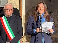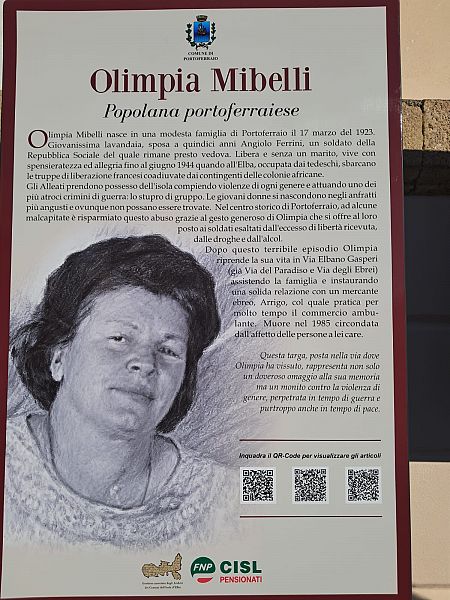 “Olimpia Mibelli - si legge nel testo del cartello esplicativo, letto nel corso della cerimonia dall’assessore Lorenza Burelli - nasce in una modesta famiglia di Portoferraio il 17 marzo del 1923. Giovanissima lavandaia, sposa a quindici anni Angiolo Ferrini, un soldato della Repubblica Sociale del quale rimane presto vedova. Libera e senza un marito, vive con spensieratezza ed allegria fino al giugno 1944 quando all'Elba, occupata dai tedeschi, sbarcano le truppe di liberazione francesi coadiuvate dai contingenti delle colonie africane. Gli Alleati prendono possesso dell'isola compiendo violenze di ogni genere e attuando uno dei più atroci crimini di guerra: lo stupro di gruppo. Le giovani donne si nascondono negli anfratti più angusti e ovunque non possano essere trovate. Nel centro storico di Portoferraio, ad alcune malcapitate è risparmiato questo abuso grazie al gesto generoso di Olimpia che si offre al loro posto ai soldati esaltati dall'eccesso di libertà ricevuta, dalle droghe e dall'alcol. Dopo questo terribile episodio Olimpia riprende la sua vita in Via Elbano Gasperi (già Via del Paradiso e Via degli Ebrei) assistendo la famiglia e instaurando una solida relazione con un mercante ebreo, Arrigo, col quale pratica per molto tempo il commercio ambulante. Muore nel 1985, circondata dall’affetto delle persone a lei care. Questa targa, posta nella via dove Olimpia ha vissuto, rappresenta non solo un doveroso omaggio alla sua memoria ma un monito contro la violenza di genere, perpetrata in tempo di guerra e purtroppo anche in tempo di pace”.