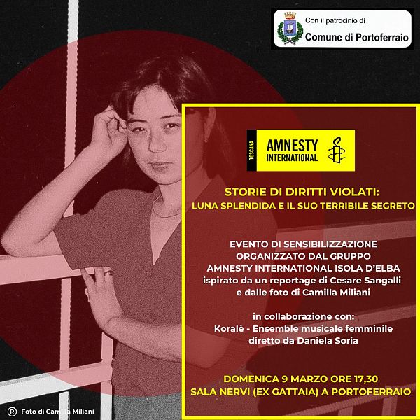 PORTOFERRAIO — Il Gruppo Amnesty International Isola d’Elba organizza domenica 9 Marzo 2025 alle ore 17,30 presso la Sala Nervi, ex Gattaia, a Portoferraio, un incontro intitolato "Storie di diritti violati: Luna Splendida e il suo terribile segreto", ispirato a un reportage dello scomparso giornalista elbano Cesare Sangalli e alle fotografie di Camilla Miliani.