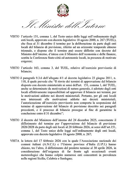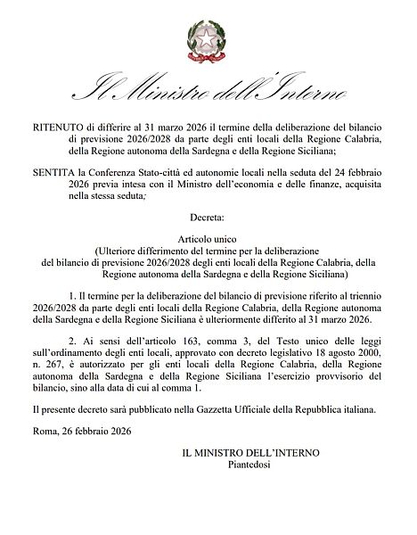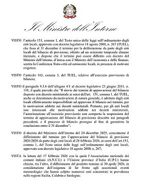 "Ricordare che il termine, rispetto alla scadenza ordinaria del 31 dicembre 2025, è stato differito al 28 febbraio 2026 non significa fare “terrorismo mediatico”, ma richiamare un dato amministrativo preciso che, se non rispettato, limita l’attività amministrativa. - prosegue Merlini - L’ulteriore differimento al 31 marzo 2026 del termine per la deliberazione del Bilancio di Previsione 2026/2028 fissato con Decreto del Ministero dell’Interno del 26 febbraio riguarda esclusivamente gli Enti locali delle Regioni Calabria, Sicilia e Sardegna, colpiti dagli eventi metereologici".