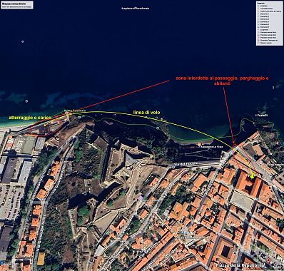 Su indicazione della ditta che gestisce l’elicottero, il sorvolo avverrà nel tratto che va dalla zona delle Ghiaie (dove è stata allestita una area di cantiere opportunamente delimitata nei pressi della piscina comunale) fino alla Caserma de Laugier, impegnando oltre al tratto di mare per il quale è stata richiesta opportuna ordinanza alla Guardia Costiera, il tratto delle Viste, Via del Falcone (nel tratto d’accesso alla Spiaggia delle Viste, incrocio con Via Victor Hugo, Piazzale Napoleone e incrocio con Via Forte Stella) e Via del Padiglione.