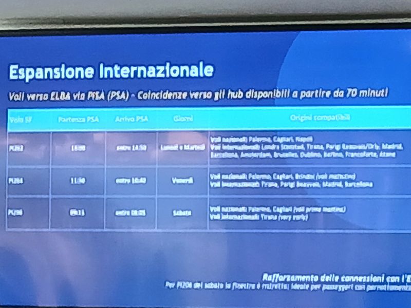 Durante la stagione ci saranno settimanalmente: 4 voli andata e ritorno su Pisa, 6 su Firenza, 4 su Milano e 2 su Roma.