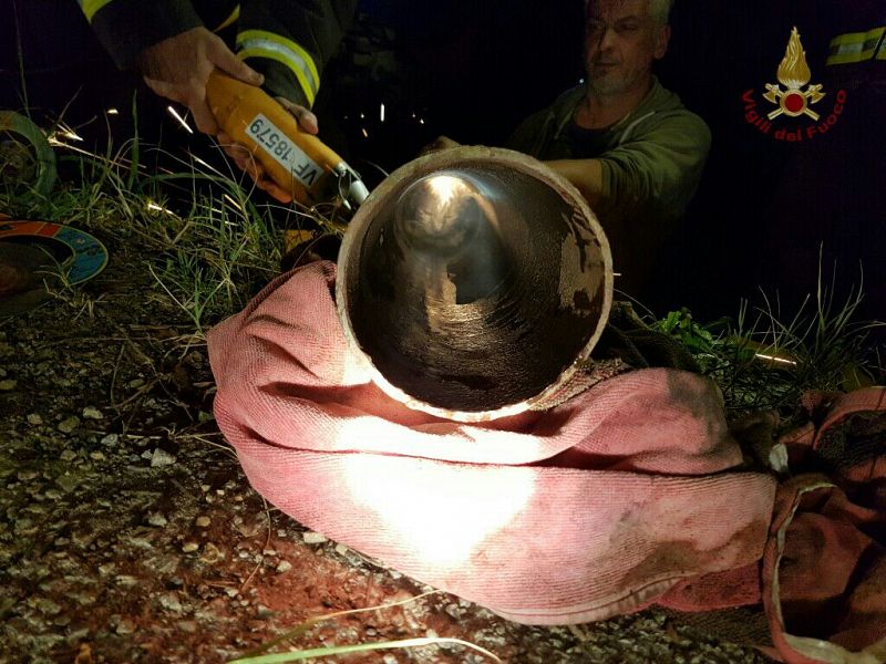 La squadra del distaccamento di Portoferraio è intervenuta tagliando con una mola il tubo e, dopo averlo estratto con attenzione, recuperando il gatto dal pertugio nel quale si era infilato.