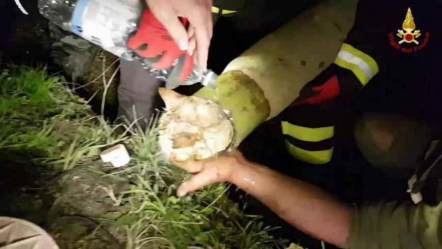 Il gatto, un esemplare adulto dal pelo rossiccio, era rimasto bloccato all'interno di un tubo di scolo di acqua piovana. Il tubo, come si vede dalle immagini fornite dagli stessi soccorritori, proseguiva con una strettoia e deve essere stato quello il punto in cui il micio è rimasto incastrato, incapace sia di proseguire sia di girarsi per tornare indietro.