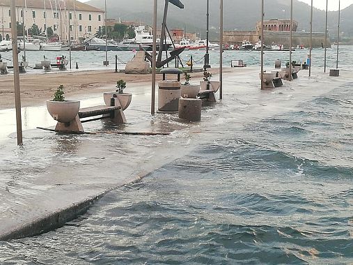 Mareggiata in corso in tutta l'Elba. Mentre il mare a Portoferraio ha invaso la banchina nella zona delle Ghiaie la situazione è più critica