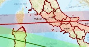 Scendono quindi a due le traiettorie che potrebbero interessare alcuni settori di nove regioni centro-meridionali italiane nell’arco temporale compreso tra le 2 di questa notte e le ore 7 di domani mattina, 9 Maggio.