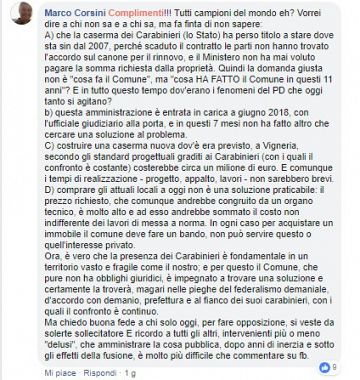 - A) che la caserma dei Carabinieri (lo Stato) ha perso titolo a stare dove sta sin dal 2007, perché scaduto il contratto le parti non hanno trovato l'accordo sul canone per il rinnovo, e il Ministero non ha mai voluto pagare la somma richiesta dalla proprietà. Quindi la domanda giusta non è 'cosa fa il Comune', ma 'cosa ha fatto il Comune in questi 11 anni'? E in tutto questo tempo dov'erano i fenomeni del PD che oggi tanto si agitano?