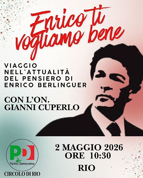 "Da una piazza ricorderemo il pensiero di Enrico Berlinguer e la sua straordinaria attualità, ancora oggi, in un Paese profondamente attraversato da cambiamenti che incidono nella vita di ciascuno di noi. - scrive Fabrizio Ania, segretario del Circolo Pd di Rio - Ma avrà un significato in più: gli spazi pubblici, aperti e chiusi, sono luoghi di partecipazione e di libertà".