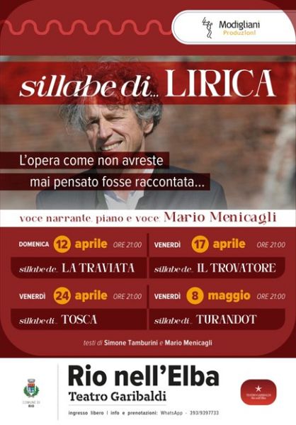 Come si legge in una nota diffusa dal Comune di Rio, domenica 12 Aprile alle ore 21, il Maestro Mario Menicagli presenterà lo spettacolo “Sillabe di lirica”, un percorso affascinante nel mondo dell’opera che prenderà avvio con “La Traviata”, primo capolavoro protagonista della serata.
