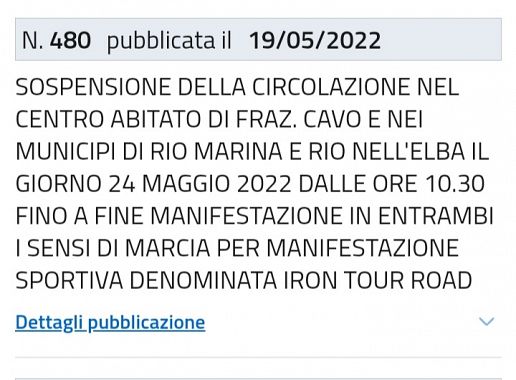 Ci viene infine segnalato che sull'Albo pretorio del Comune di Rio è stata pubblicata in data 19 maggio un'ordinanza di sospensione della circolazione stradale nei centri abitati di Rio Marina, Rio nell’Elba e Cavo per il passaggio del triathlon ma per il giorno 24 Maggio (vedi pdf in fondo all'articolo) mentre l'ordinanza di chiusura delle strade provinciali si trova sull'Albo pretorio della Provincia di Livorno (vedi pdf in fondo all'articolo).